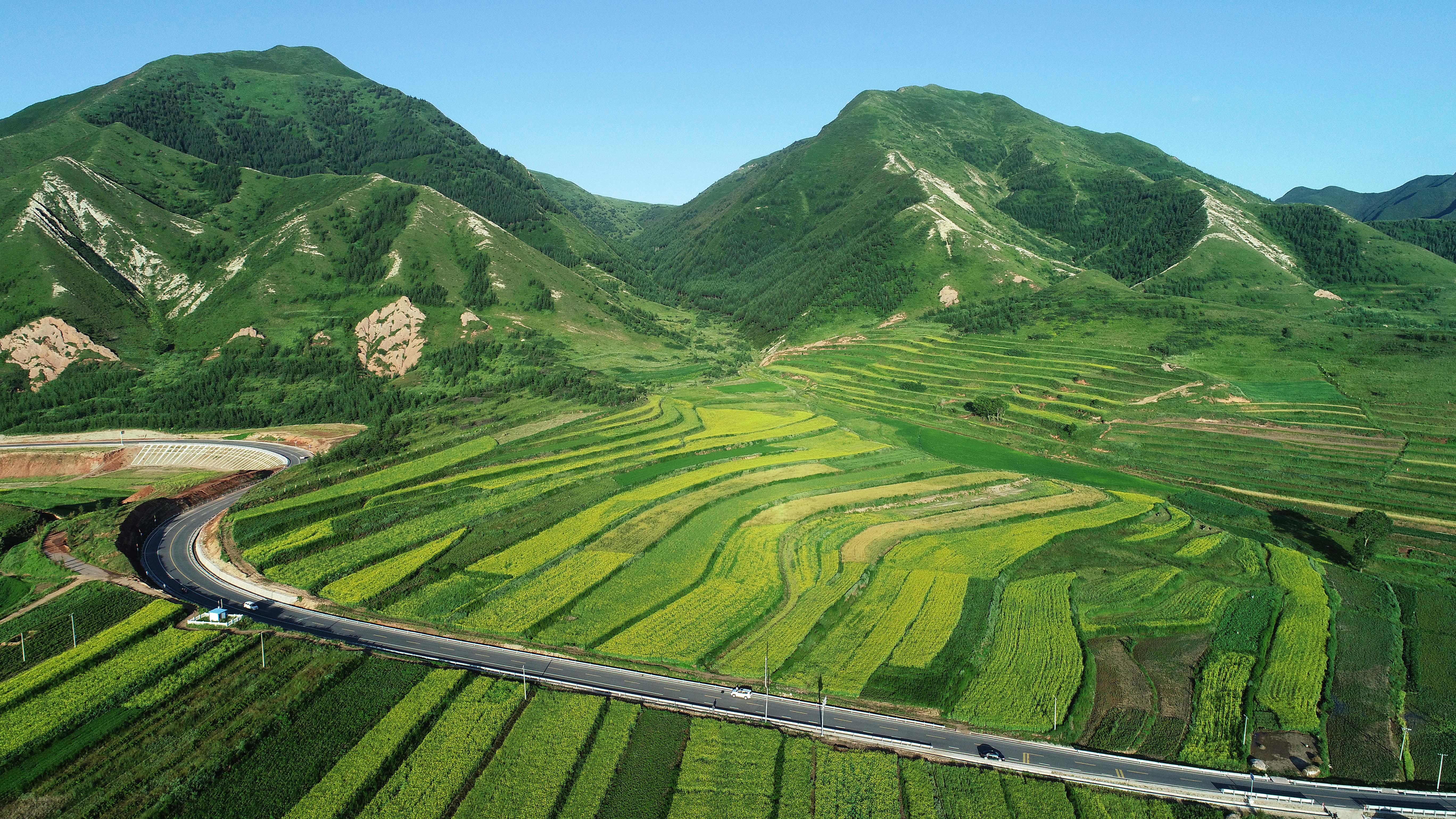Liupanshan Mountain and farmlands on its foot in Longde County of Guyuan City, northwest China's Ningxia Hui Autonomous Region. (Xinhua/Wang Peng)