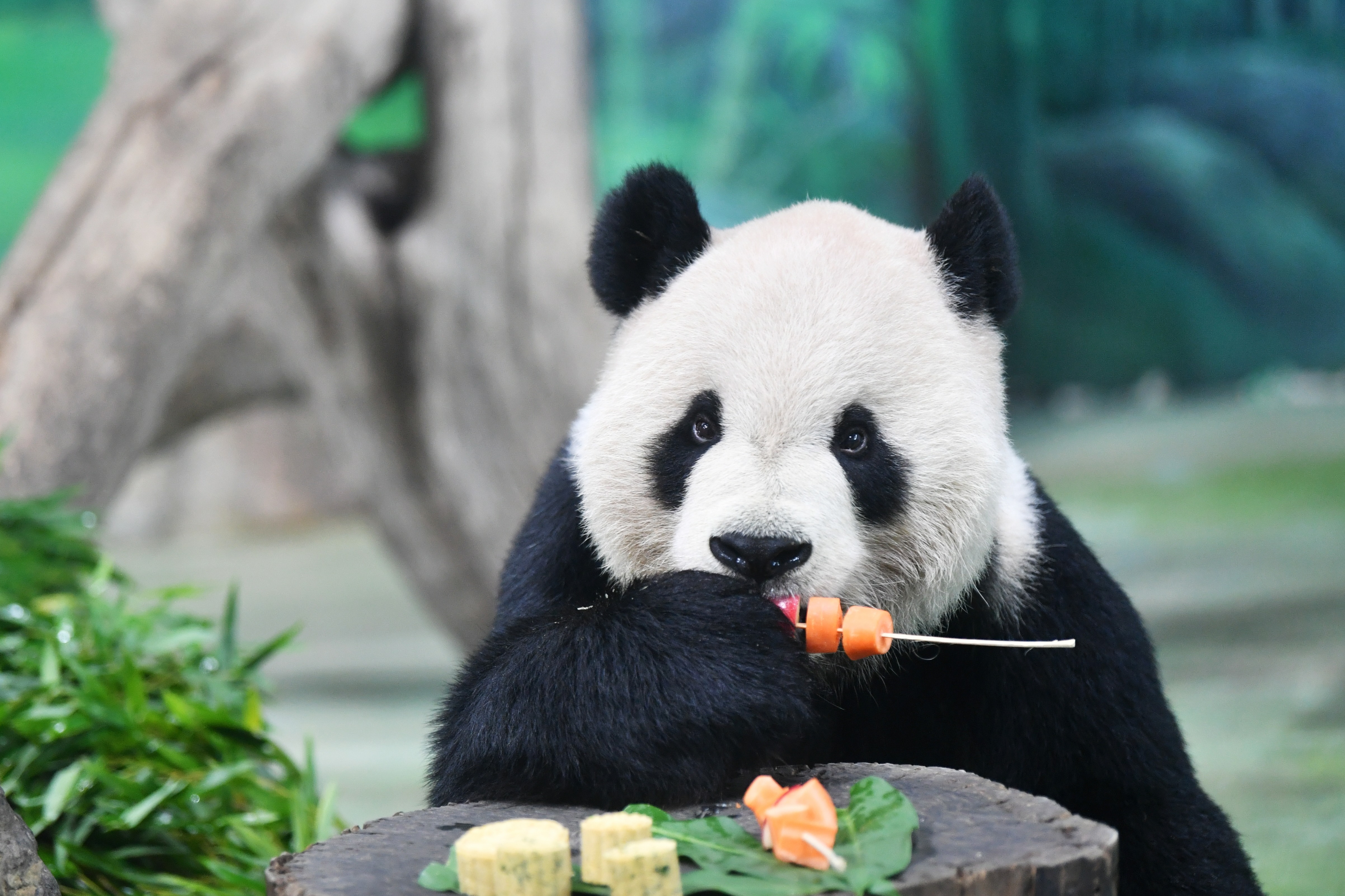 Giant panda Tuantuan eats skewered fruits and vegetables at Taipei Zoo in Taipei, southeast China's Taiwan, Sept. 13, 2019. Moon cakes and skewered fruits and vegetables were specially made by the staff of Taipei Zoo for giant pandas to celebrate the the Mid-Autumn Festival. (Xinhua/Chen Bin)