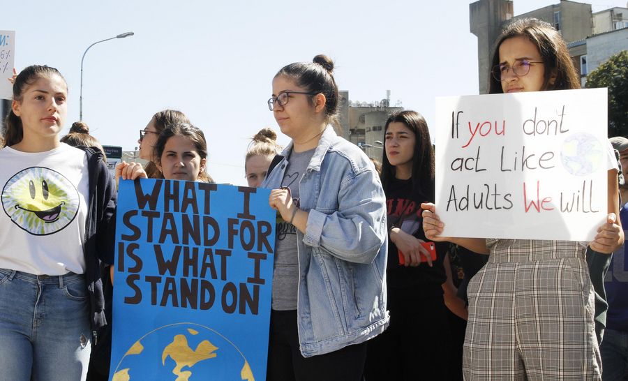 High school students hold placards during a rally against global warming in front of the government building in Skopje, North Macedonia, Sept. 20, 2019. (Photo by Darko Duridanski/Xinhua)