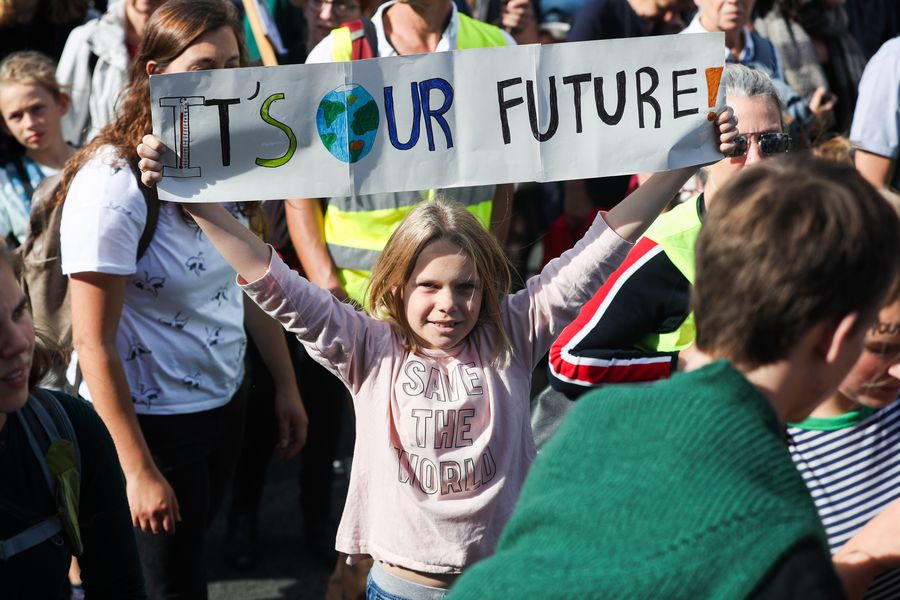 A girl holds a placard during a march calling for action against climate change in Brussels, Belgium, Sept. 20, 2019. (Xinhua/Zheng Huansong)