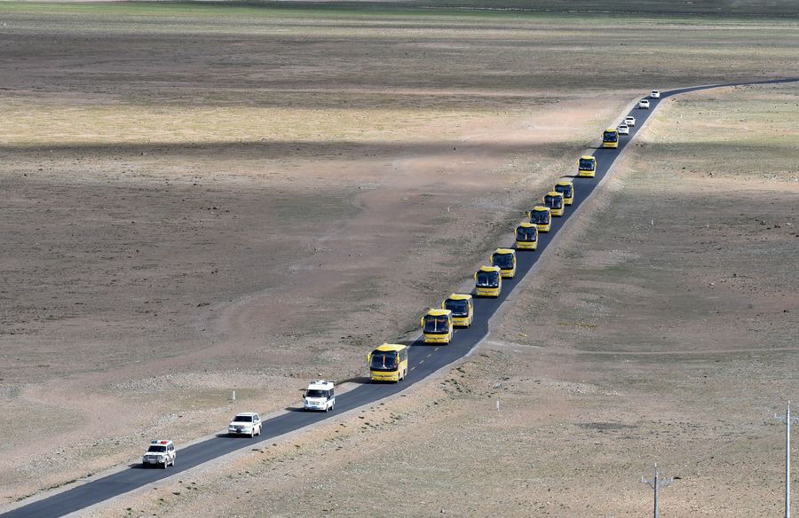 Photo taken on June 18, 2018 shows a fleet of vehicles on the way to relocate people from Rongma Town of Nyima County to Lhasa. (Xinhua/Chogo)