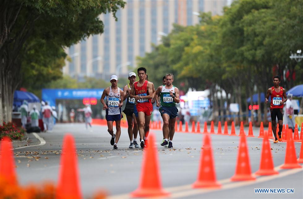 Xu Hao (front) of China competes during men's 20km race walk final of track and field at the 7th CISM Military World Games in Wuhan, capital of central China's Hubei Province, Oct. 25, 2019. (Xinhua/Wang Lili)