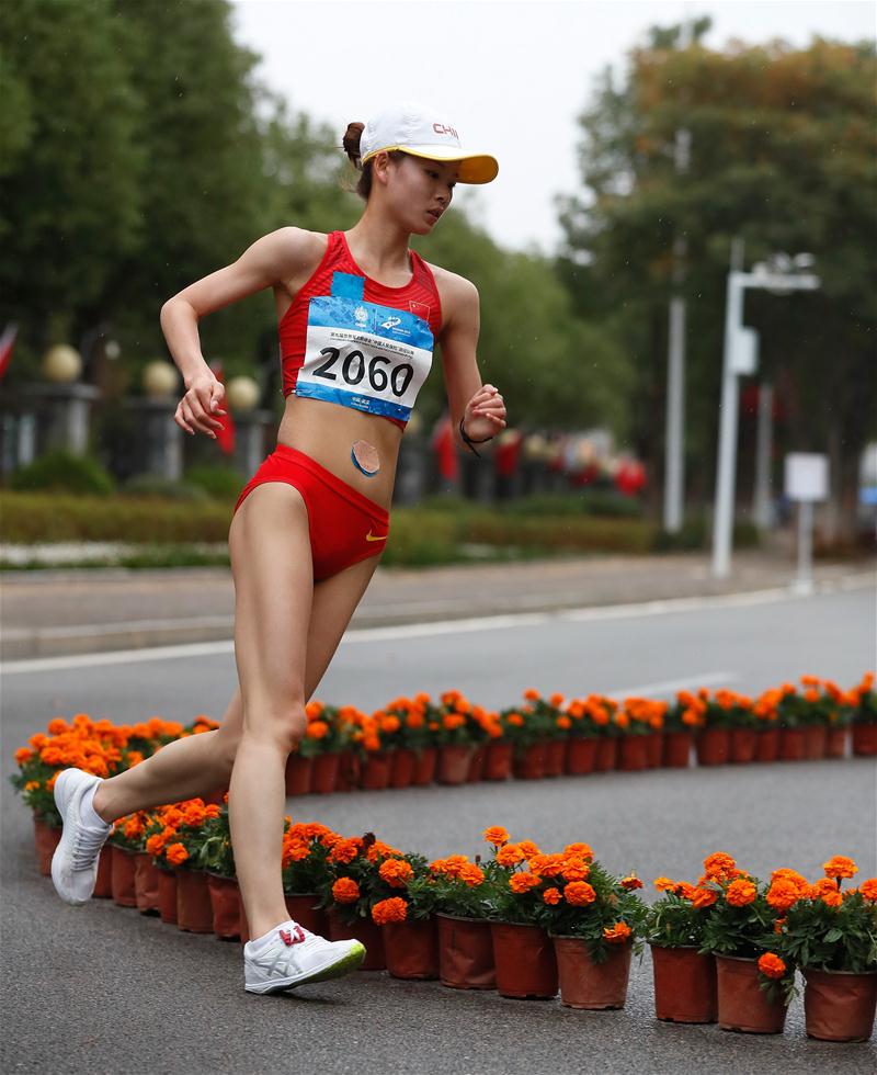 Yang Jiayu of China competes during women's 20km race walk final of track and field at the 7th CISM Military World Games in Wuhan, capital of central China's Hubei Province, Oct. 25, 2019. (Xinhua/Wang Lili)