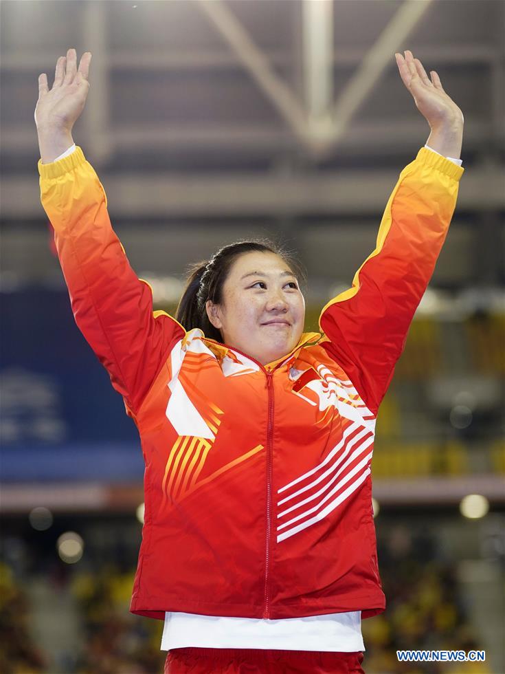 Zhang Li of China celebrates during the awarding ceremony of the women's javelin throw final of track and field at the 7th CISM Military World Games in Wuhan, capital of central China's Hubei Province, Oct. 25, 2019. (Xinhua/Jin Liangkuai)