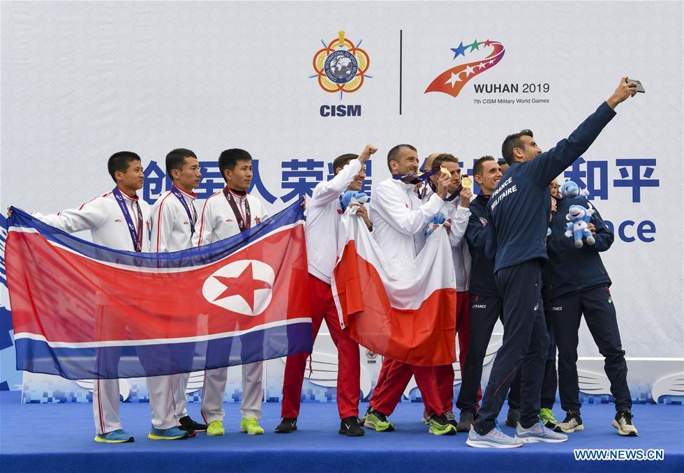 Gold medalists team Poland, silver medalists team of the Democratic People's Republic of Korea (DPRK) and bronze medalists team France attend the awarding ceremony of the men's marathon team of track and field at the 7th CISM Military World Games in Wuhan, capital of central China's Hubei Province, Oct. 27, 2019. (Xinhua/Hu Huhu)