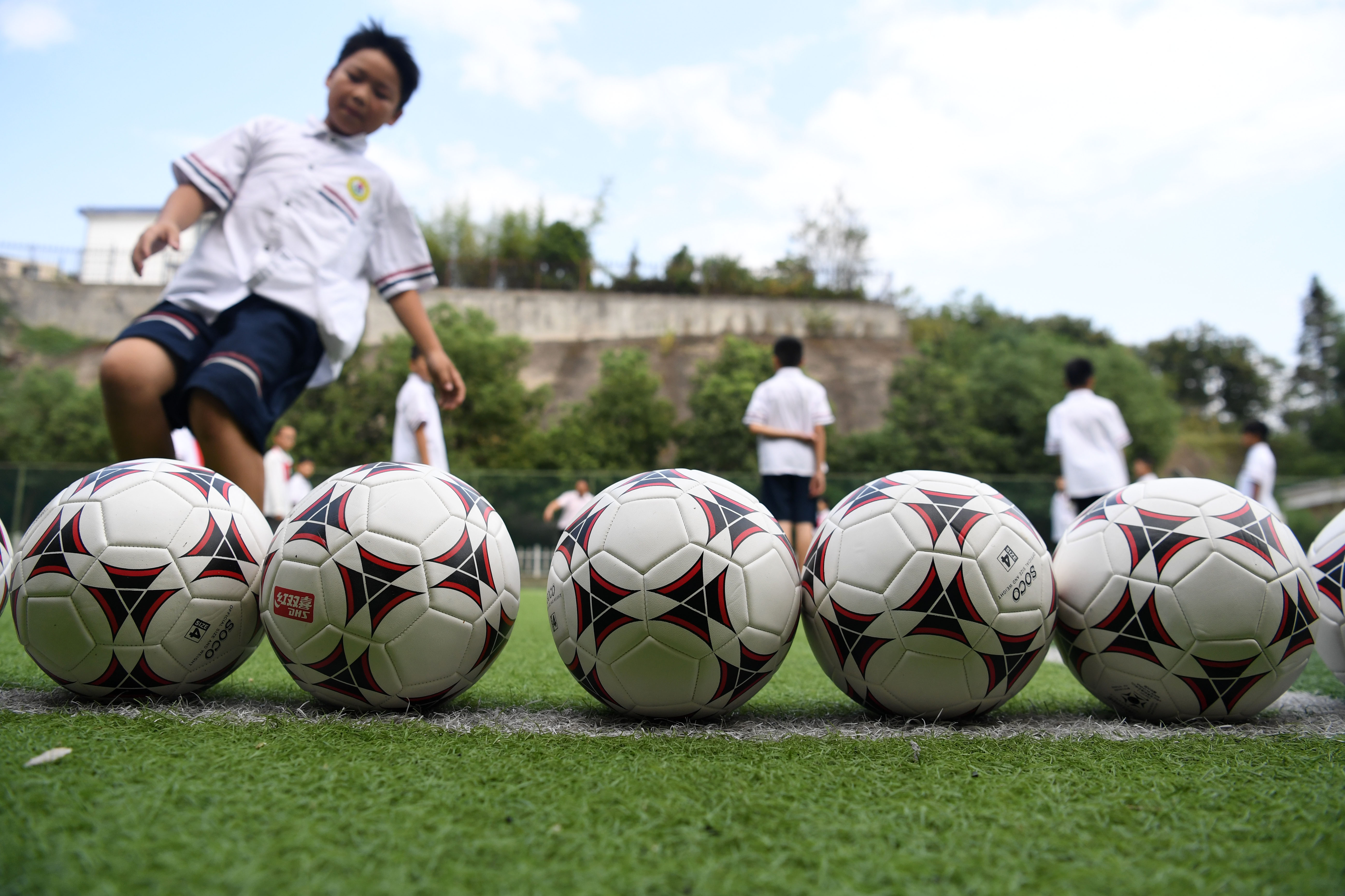 Pupils have football class at the Jinzhai County primary school in Jinzhai, east China's Anhui Province, Sept. 3, 2019. (Xinhua/Liu Junxi)