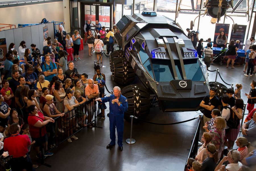 Retired NASA Astronaut Jon McBride speaks to the crowd in front of the NASA Mars rover concept vehicle during Mars Day at the National Air and Space Museum in Washington D.C., the United States, on July 21, 2017. (Xinhua/Ting Shen)