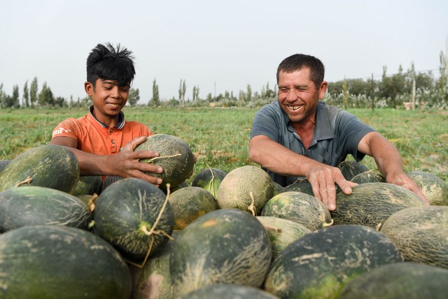 Farmers load a vehicle with Jiashi cantaloupes in the field in Jiashi county of Kashgar, northwest China's Xinjiang Uygur Autonomous Region, Aug. 11, 2019. Farmers here were busy with collecting Jiashi cantaloupes as the harvest season came. (Xinhua/Ding Lei)