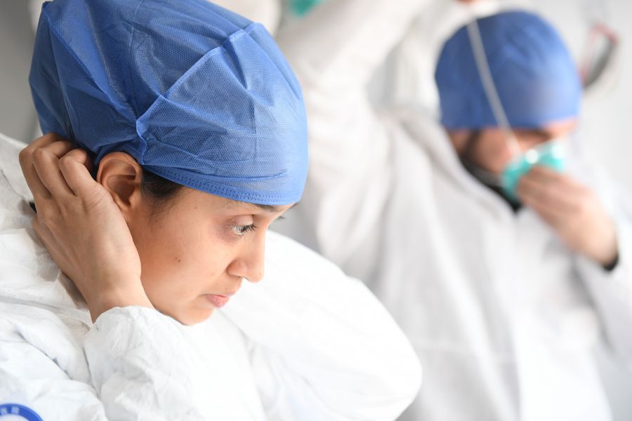 Pakistani Abdul Zahir Hamad (L) helps his wife Mauritian Hosany Sumayyah wear the glove before getting into work at a novel coronavirus prevention-and-control checkpoint of an expressway exit in Wenzhou, east China's Zhejiang Province, Feb. 8, 2020.(Xinhua/Weng Xinyang)