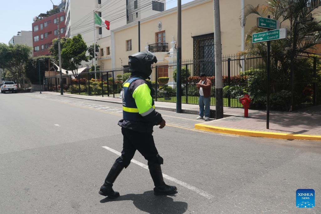 A Peruvian police officer walks near the Mexican Embassy in Lima, Peru, Nov. 4, 2025. The government of Peru has decided to break diplomatic relations with Mexico, Peruvian Foreign Minister Hugo de Zela told a press conference on Monday. (Photo by Mariana Bazo/Xinhua)