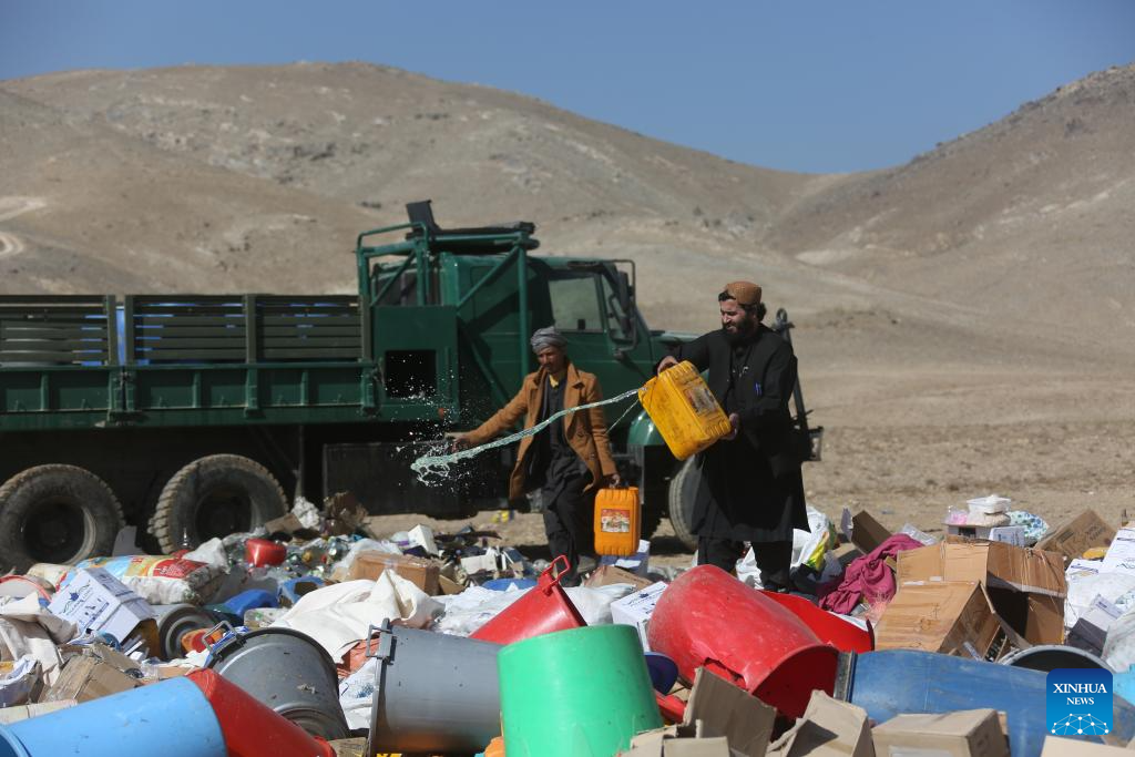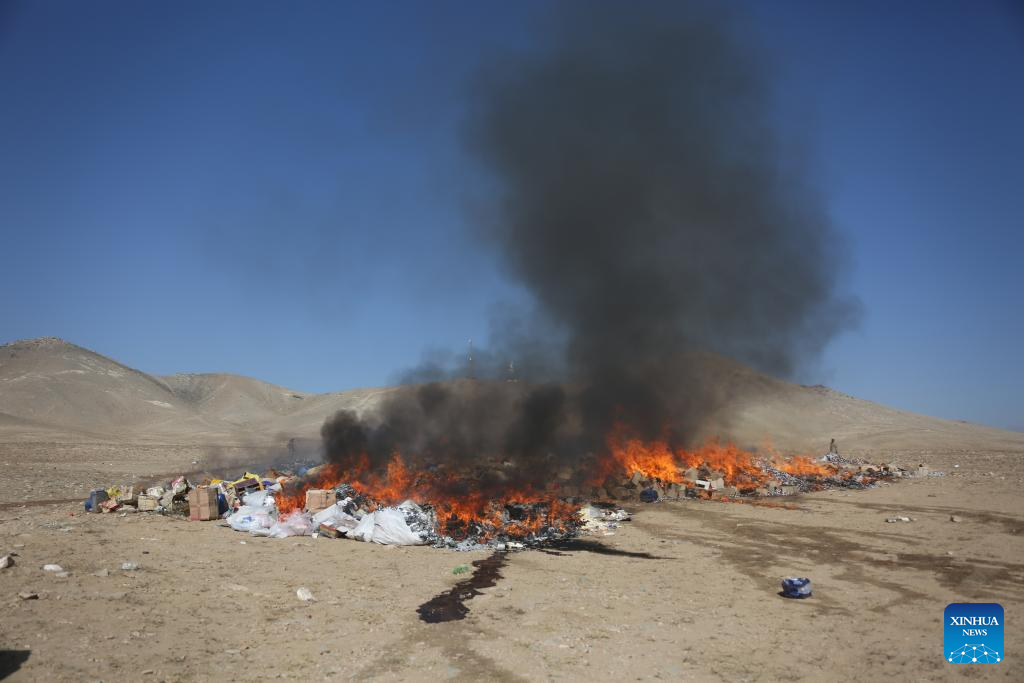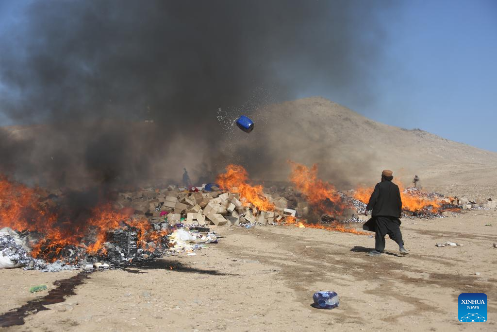 KABUL, Nov. 9 (Xinhua) -- Afghan authorities destroyed on Sunday nearly 220 tons of illicit drugs by fire, confiscated during operations across the central region including capital Kabul, state-run Radio and Television Afghanistan (RTA) reported.