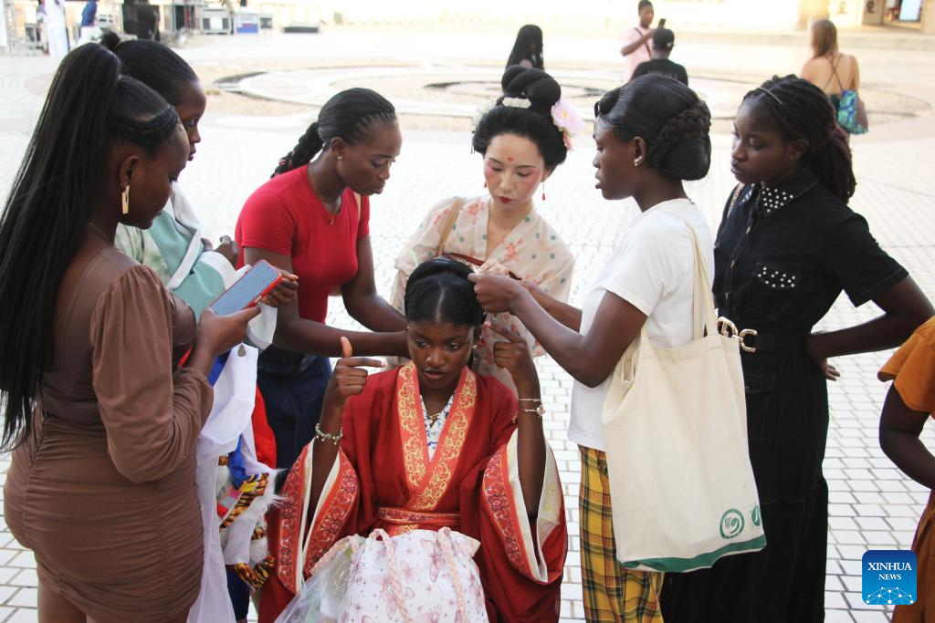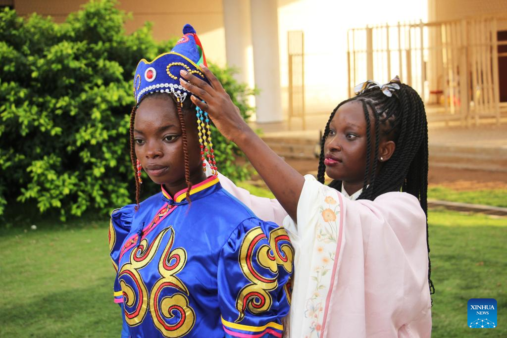 Students from the Confucius Institute of the University of Abomey-Calavi prepare their traditional Chinese attires for the China-Benin Fashion Show at the central square of the Palais des Congres in Cotonou, Benin, Nov. 8, 2025. (Photo by Seraphin Zounyekpe/Xinhua)
