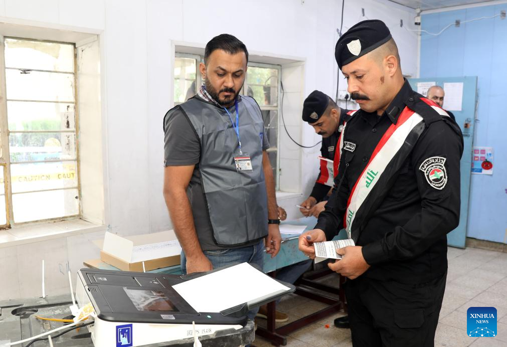 Iraqi security force members vote at a polling station in Baghdad, Iraq, Nov. 9, 2025. Iraq opened early voting on Sunday for security forces and displaced people ahead of the country's parliamentary elections scheduled for Tuesday, officials said. (Photo by Khalil Dawood/Xinhua)