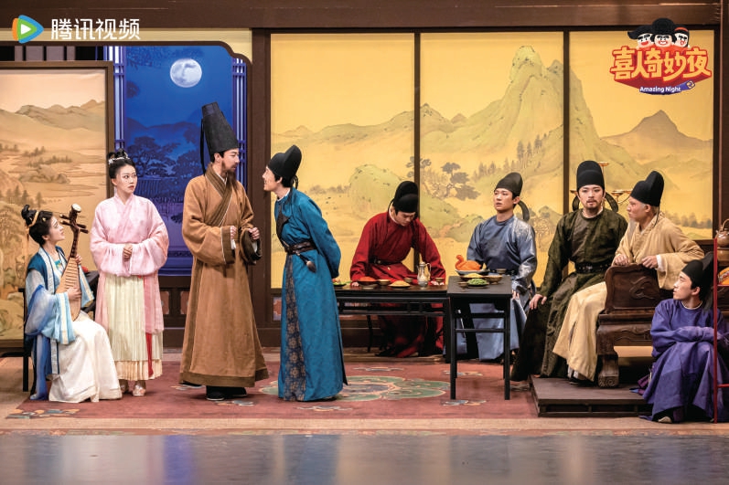 第五期节目中,一个场景引起了观众的注意:在作品《夜宴》落幕时,所有演员错落站立,以姿态与神情复刻出了《韩熙载夜宴图》。这个充满仪式感与冲击力的画面不仅是一个作品的收官,也是一种创作理念的凸显——群像喜剧,正以前所未有的质量与完成度在本季舞台上大放异彩。