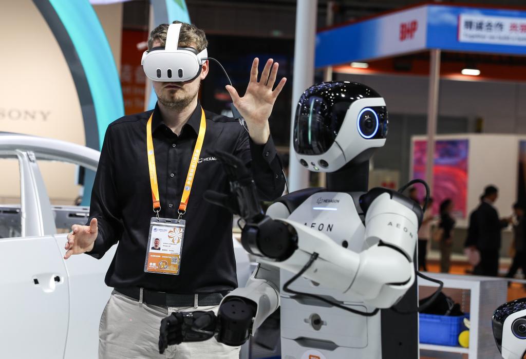 11月5日,工作人员在第八届进博会技术装备展区展示一款工业场景人形机器人。