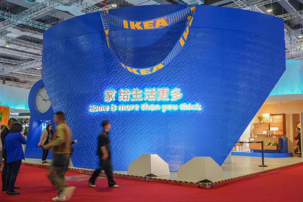 11月5日,人们从第八届进博会消费品展区宜家展台前走过。