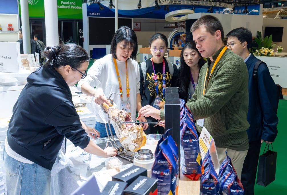 11月5日,观众在第八届进博会农食产品展区大商集团展台品尝进口火腿。