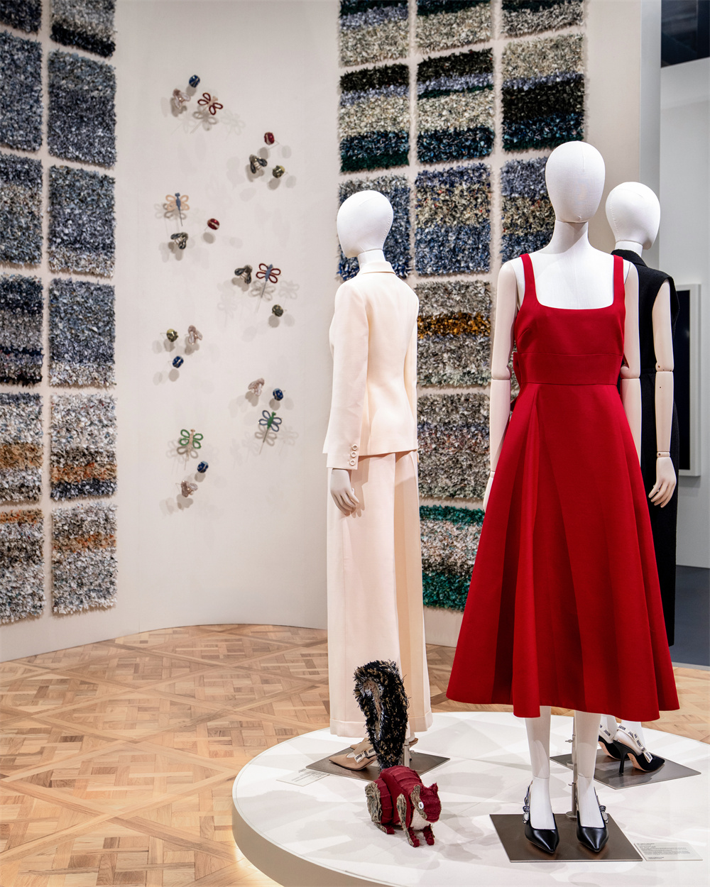 在展区中央,迪奥带来了多款以可持续理念设计的产品,涵盖男装与女装成衣系列。这些作品选用经认证的可持续面料,遵循严格的环境与社会标准,从原料、工艺到制作流程皆力求降低对生态的影响。