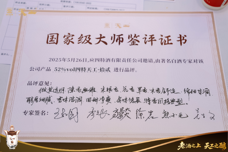 在5月26日上午举行的国家级大师鉴评会上,由王新国、季克良、高景炎等业内重量级专家组成的评审团现场鉴评样酒,并一致给予“微黄透明、陈香幽雅、米粮香、果香、木香舒适,入口绵甜甘润,酒体醇厚细腻、香味谐调、回甜净爽、余味悠长”的高度评价,认为其为特香风格典型之作。