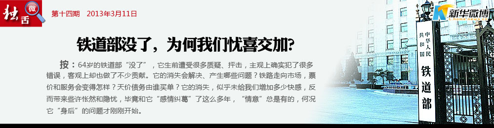 @秋水伊人:之前累積的債務問題如何解決?誰是還債主體?明年春運被“吐槽”的是誰?撤銷鐵道部體現了改革的決心,希望能有好的轉變。