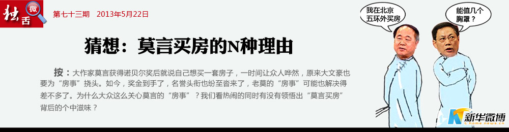 猜想二:安得廣廈五環外 安居才能樂業,即便莫言用諾貝爾獎金買房,也是可以理解的。一直以來,文人的命運,往往與時代命運息息相關。居高不下的房價,卻是百姓之痛。
