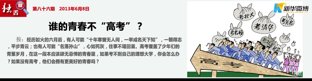 【只是青春的一場過云雨】 一直以為人生只有兩段,高考前與高考后,越是臨近高考,越是不敢想象未來。世界末日算不上,但世界裁決日毫不夸張。今天看來,關系要好的十幾位朋友中,或企業精英,或自主創業,都有讓人羨慕的成績,他們一半高考正常,一半高考失利。