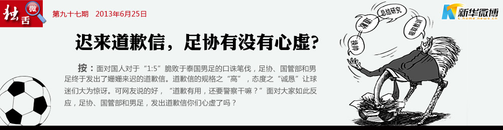 央視也不能忍了 “這樣的檢查沒有觸及靈魂,應(yīng)該打回去重寫。”——央視評足協(xié)道歉。足協(xié)、國管、國足上演道歉信帽子戲法,怎么看怎么像兒戲,別說觸及靈魂了,純屬耍嘴皮子。