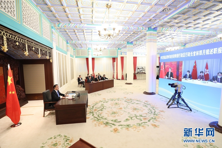 1月27日,國務(wù)院總理李克強在北京中南海紫光閣以視頻連線方式聽取香港特別行政區(qū)行政長官林鄭月娥2020年度的述職報告。國務(wù)院副總理韓正出席。新華社記者 王曄 攝