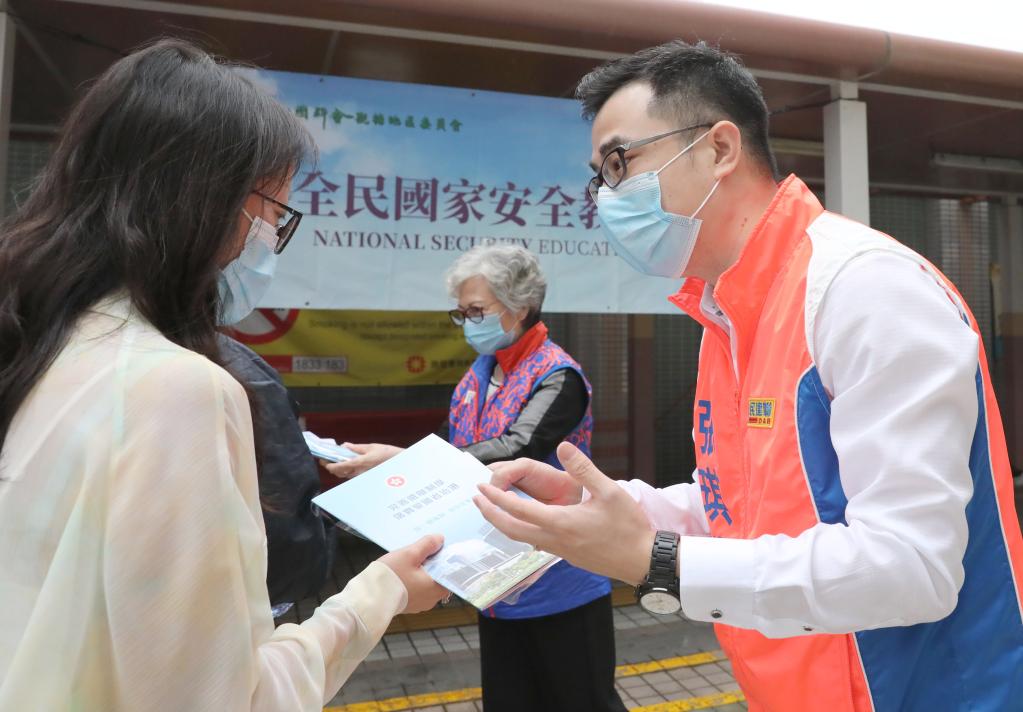 2021年4月15日,香港市民張琪騰(右)在全民國家安全教育日活動上宣講國家安全理念。新華社記者 吳曉初 攝