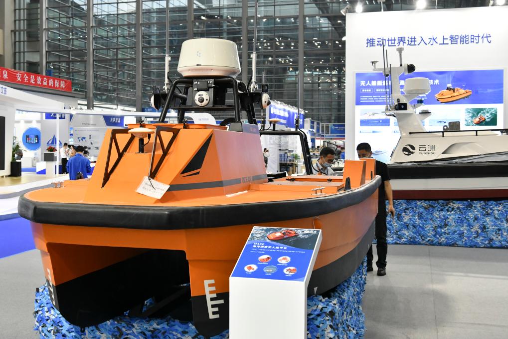 2022年11月24日,观众在海博会现场了解云洲无人船。新华社记者 梁旭 摄