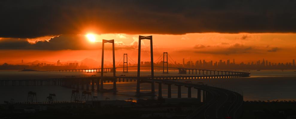 2025年9月14日,深中通道与初升的朝阳交相辉映。新华社记者 邓华 摄