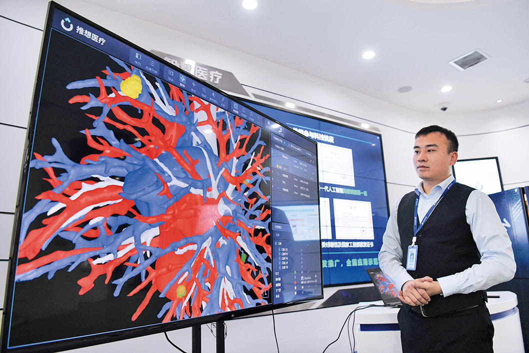 2021年12月24日,工作人员在位于安徽省合肥市西郊的中国声谷体验中心内介绍一款智慧医疗产品