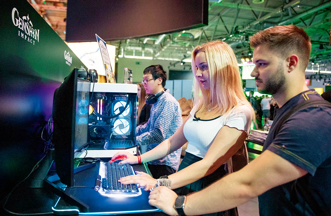 人们在2024年科隆国际游戏展米哈游展台试玩游戏《原神》