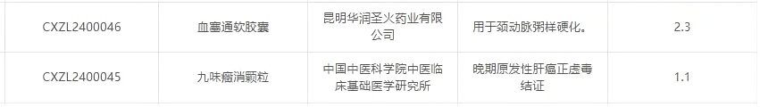 据国家药品监督管理局药品审评中心官网显示,2款中药新药获得临床试验默示许可,分别为华润圣火的2.3类新药“血塞通软胶囊”、中国中医科学院中医临床基础医学研究所的1.1类新药“九味癥消颗粒”。