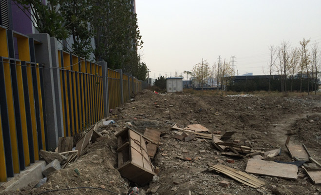 由于項目后期還在建設中,透過小區東邊未被圍擋遮擋處,記者觀察到黃土裸露、垃圾遍地,一陣風后吹起塵土,讓人踹不上氣來。