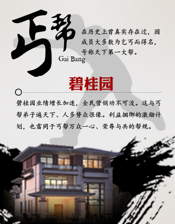 碧桂園 丐幫 丐幫因成員大多數(shù)為乞丐而得名,號(hào)稱天下第一大幫。 碧桂園是今年房企風(fēng)頭最勁的一匹黑馬。和丐幫人多勢(shì)眾一樣,全民營(yíng)銷,其躋身千億軍團(tuán)的最大功臣。