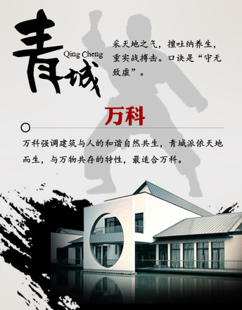 萬科 青城派 青城派擅長(zhǎng)吐納養(yǎng)生,注重實(shí)戰(zhàn)搏擊。 萬科始終以穩(wěn)健規(guī)范的經(jīng)營(yíng)作風(fēng)著稱。強(qiáng)調(diào)建筑與人的和諧自然共生,青城派與自然萬物共存的特性,最適合萬科不過。