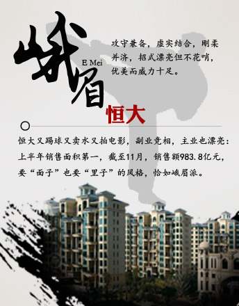 恒大 峨眉派 峨眉派攻守兼?zhèn)洌搶?shí)結(jié)合,剛?cè)岵?jì),招式漂亮但不花哨。 恒大既搞副業(yè),又攻主業(yè),樣樣風(fēng)生水起。年度銷售額新入圍千億俱樂部。要面子也要里子的風(fēng)格,恰如峨眉派。