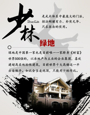 綠地 少林派 少林是體系最龐大的門派,招法剛健有力、攻防兼?zhèn)洹銓?shí)無華。 綠地是中國(guó)首家躋身《財(cái)富》世界500強(qiáng)的,以房產(chǎn)為主業(yè)的企業(yè)。項(xiàng)目遍及全國(guó),世界十大高樓近一半來自綠地。