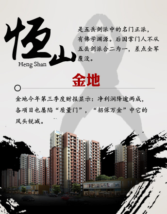 金地 恒山派 原是五岳劍派中的名門正派,有佛學(xué)淵源。后差點(diǎn)全軍覆沒。 金地過去為業(yè)界四大天王之一。但其今年第三季度財(cái)報(bào)顯示:凈利潤(rùn)降逾兩成,各項(xiàng)目屢陷質(zhì)量門,天王冠冕也不保。
