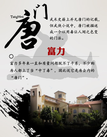 富力 唐門 唐門用毒之名,天下皆知。 富力擁有一級(jí)開發(fā)資質(zhì),卻總是遭業(yè)主維權(quán)。因壓縮成本、過快擴(kuò)張導(dǎo)致的質(zhì)量問題一再曝光。讓購(gòu)房人后悔不迭,因此說富力是房企內(nèi)的“唐門”。