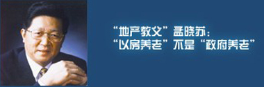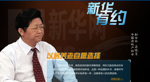 9月13日,國務院發布了《關于加快發展養老服務業的若干意見》 (以下簡稱《意見》,重點提出“開展老年人住房反向抵押養老保險試 點”,在網上引起熱議。9月26日,匯利基金董事長、幸福人壽原董事 長孟曉蘇教授做客由新華房產和新華網采訪部聯合推出的《新華有約》 欄目,與網友交流如何看待“以房養老”等熱點話題。