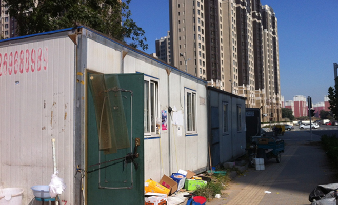 由于小區(qū)周邊還沒有完全建成,周邊還有很多臨時修建的房子沒有拆除,很多車并沒有停進(jìn)停車場,小區(qū)前的車道沒有啟用,兩邊加了圍擋,變成了臨時停車場。