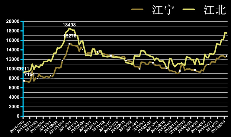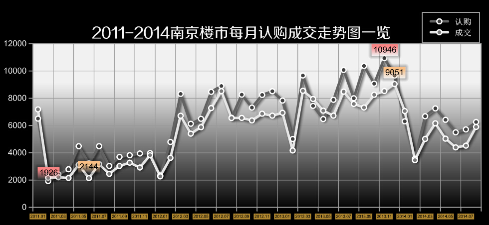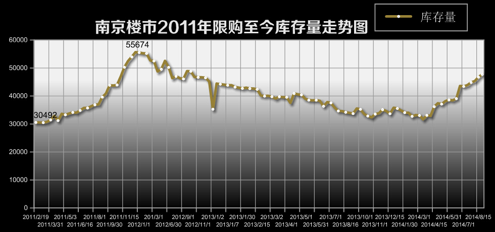 2011年1月26日,國務院出臺"國八條",嚴厲出擊調控樓市,“限購”成了重點;2011年2月19日,南京響應“國家政策”出臺了地方版限購令。這一年,南京市場需求受到相當大程度的壓制 ,成交一直處于低迷,商品房住宅銷量急劇下滑。 然而,限購的威力也僅維持了一年。隨后的2012、2013年,壓制的需求開始釋放,南京商品房銷量呈現爆發性增長,直至2014年才有所放緩。 [詳細]