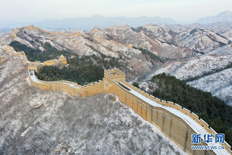 這是3月1日在河北承德境內(nèi)拍攝的金山嶺長城雪景(無人機(jī)照片)。新華社發(fā)(周萬平 攝)