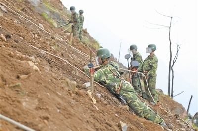 ??? 2月6日,云南省軍區掃雷指揮部掃雷四隊官兵系著繩索,在陡峭的雷場進行人工搜排作業。嚴浩 攝