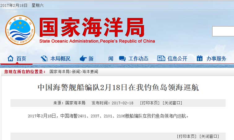 新華網北京2月18日電 據國家海洋局網站報道,2017年2月18日,中國海警2401、2337、2101、2106艦船編隊在我釣魚島領海內巡航。
