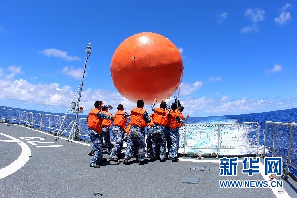 2月19日,在海上現場反擊演練中,長沙艦艦員在飛行甲板上向指定海域布放模擬“敵艦”的漂浮靶標。