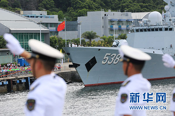 7月7日,海軍銀川艦駛?cè)胂愀郯捍薮a頭。當(dāng)日,正在執(zhí)行跨區(qū)機(jī)動(dòng)訓(xùn)練任務(wù)的中國(guó)人民解放軍海軍航母編隊(duì)抵達(dá)香港,參加香港回歸祖國(guó)暨中國(guó)人民解放軍進(jìn)駐香港20周年慶祝活動(dòng),受到香港特區(qū)政府和民眾熱烈歡迎。新華社記者 曾濤 攝