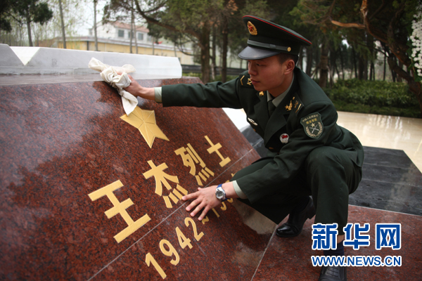 “王杰班”第29任班長劉佳玉擦拭王杰烈士紀(jì)念碑(2014年4月3日攝)。新華社發(fā)(趙聰 攝)